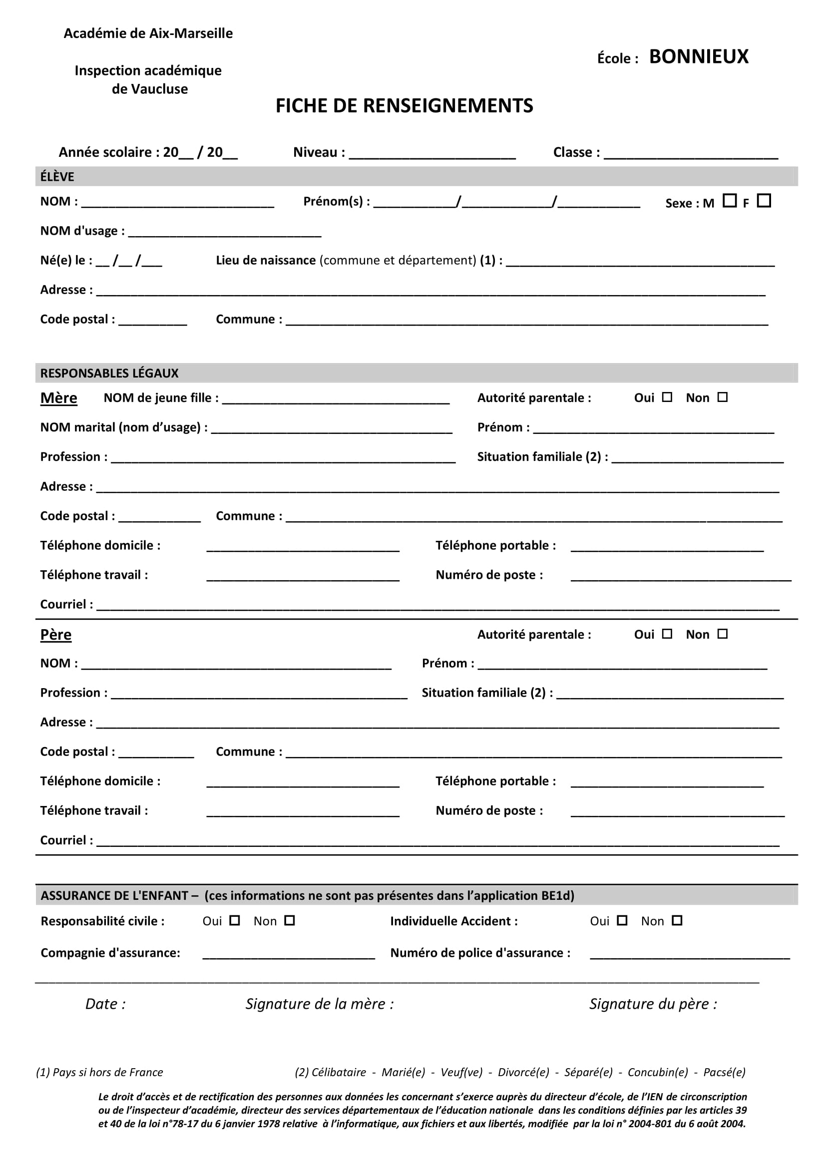 Pour une inscription en cours d’année, nous vous invitons à compléter la fiche de renseignements et à la retourner en mairie avec les documents suivants :